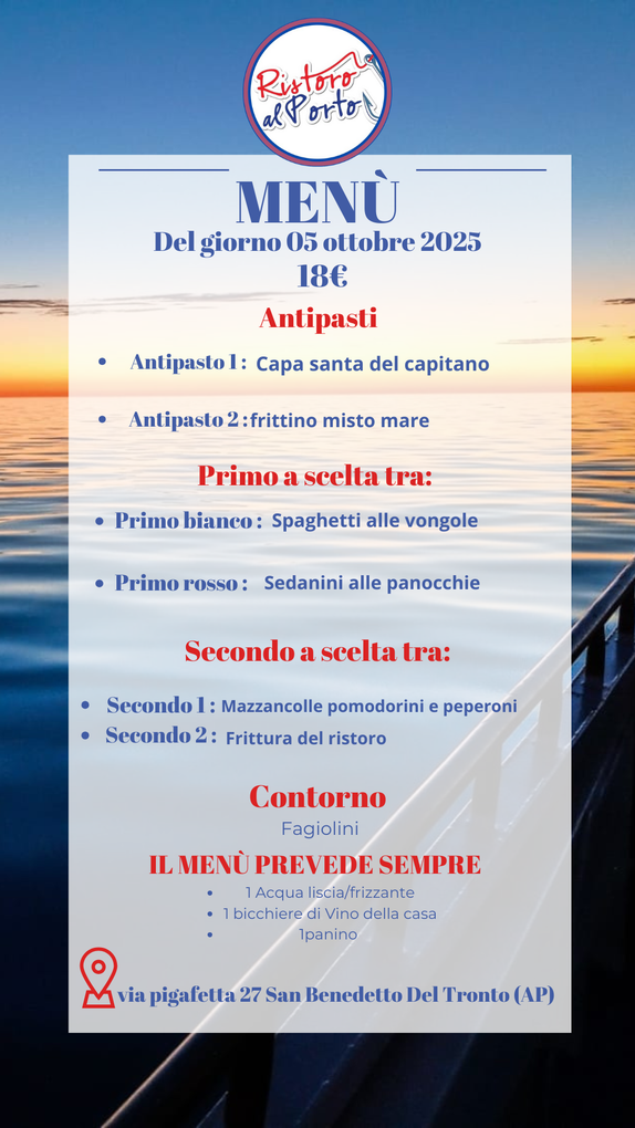 Via Pigafetta, 27 (Zona Ballarin) - 63074 S.Benedetto Del Tronto (AP) - PRENOTAZIONI ED ASPORTI +39 351 4167313 - E.mail: ristoroalportosbt@gmail.com